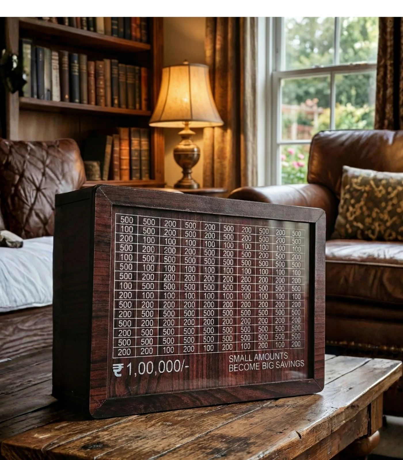 Transform the way you save with our beautifully crafted Sheesham Wood Savings Challenge Piggy Bank. Designed around the highly motivating “100 Days to ₹1,00,000” concept, this interactive money box turns financial discipline into a fun and rewarding game. The front face features a laser-engraved grid of varying denominations. Every time you drop cash into the top slot, simply track your progress on the grid. As the famous engraved quote on the box says: “Small amounts become big savings.” Handcrafted from authentic Sheesham wood by expert artisans, this durable and elegant piece serves as both a powerful motivational tool and a sophisticated addition to your home decor. Whether you are saving for a dream vacation, a new gadget, or building an emergency fund, hitting your 1 Lakh milestone has never been this stylish.